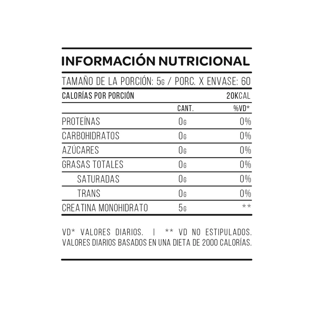 100% creatina monohidrato micronizada de grado farmacéutico. No contiene agregados, aditivos, colorantes ni conservantes.