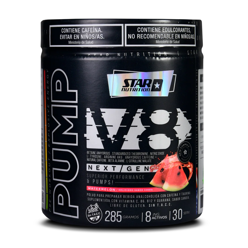 Pump V8 es un suplemento pre-entrenamiento con 8 ingredientes activos clave para lograr sesiones más intensas, duraderas y con mayor volumen muscular. Brinda energía, motivación y potencia gracias a sus vasodilatadores, cafeína, guaraná y vitaminas esenciales.